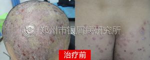 现病史:曾口服中汤药1月余,外抹自制药水(疑有激素)1月余,在新乡外抹氟米松(1月),光疗,口服银屑灵。