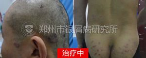 查体:全身散在点片状皮损伴鳞屑,以头部、四肢皮损较重,多处新出红色点状皮损。已告知病人及其家属病情处于急性发展期,近期有加重情况是属于正常,病人及家属表示理解并同意治疗!