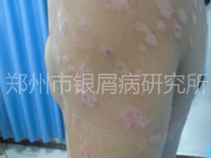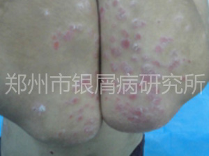 查体:患者全身散在皮损伴较多鳞屑有新出红色点疹。经检查患者处于进展期在治疗期间会有新出,表示理解并同意治疗。