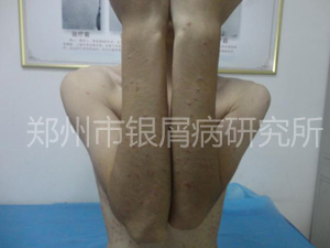 查体:全身散在点片状皮损伴鳞屑,以头部、四肢皮损较重,多处新出红色点状皮损。已告知病人及其家属病情处于急性发展期,近期有加重情况是属于正常,病人及家属表示理解并同意治疗!