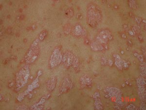 银屑病的症状在进行期是较难熬的一段时间。进行期皮损炎症比较明显,常表现为鲜红色,上面覆盖有疏松的,容易脱落的的银白色鳞屑,皮损的周边常有一圈红晕,在进行期,如刺激健康皮肤表面,即可发生银屑病样皮损,称为“同形反应”,这是银屑病特征性表现之一,“同形反应”可继发于外伤,单纯刺激、注射、手术切口等,也可继发于湿疹样皮炎,或陈旧的疤痕等处,“同形反应”一般多出现在银屑病进行期。